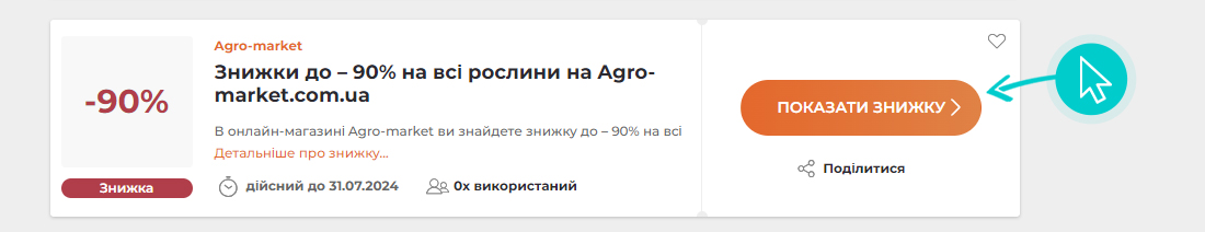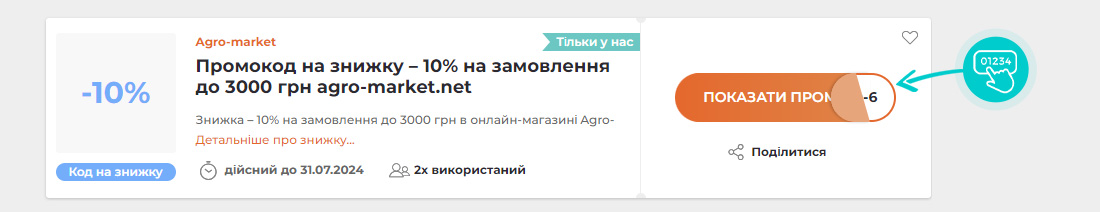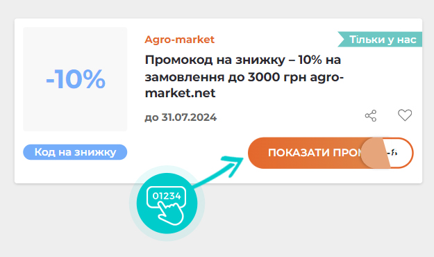 Оберіть на нашій сторінці конкретний промокод, який ви хочете використати в онлайн-магазині Agro-market.net. Натисніть на помаранчеву кнопку «Показати промокод»