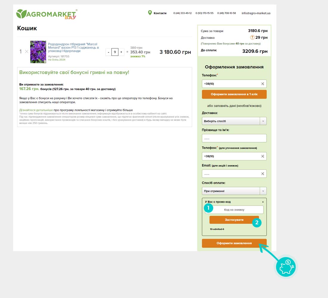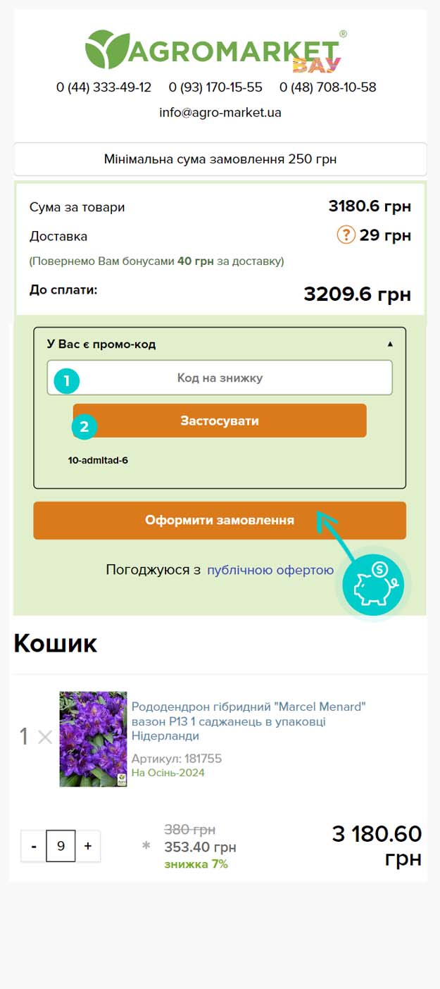 Оберіть товар, який вас цікавить, в онлайн-магазині Agro-market.net, натисніть кнопку «Додати до кошика», і продукт буде автоматично додано до кошика для замовлень. Безпосередньо в кошику ви знайдете поле «Введіть промокод» в розділі «Додати» праворуч. Вставте сюди скопійований код знижки або введіть його вручну та підтвердьте кнопкою «Застосувати».