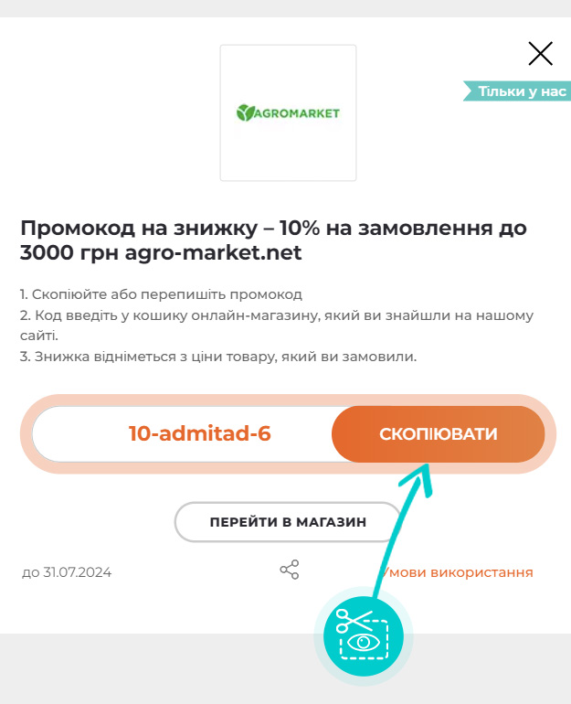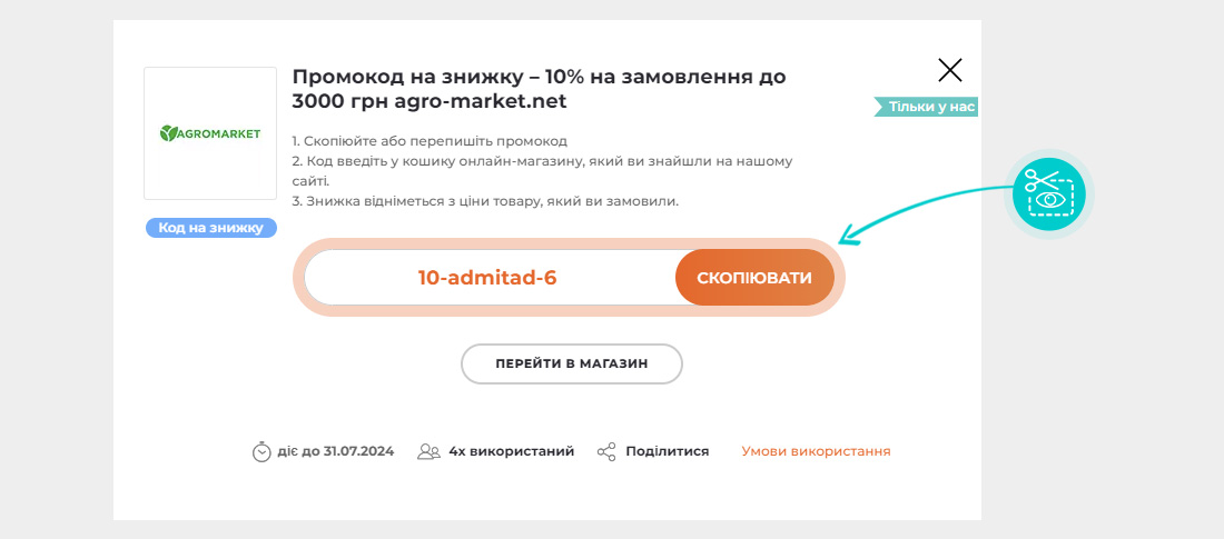 Скопіюйте або перепишіть промокод та натисніть на кнопку «Перейти в магазин». Після чого ви перейдете безпосередньо на сторінку Agro-market.net.