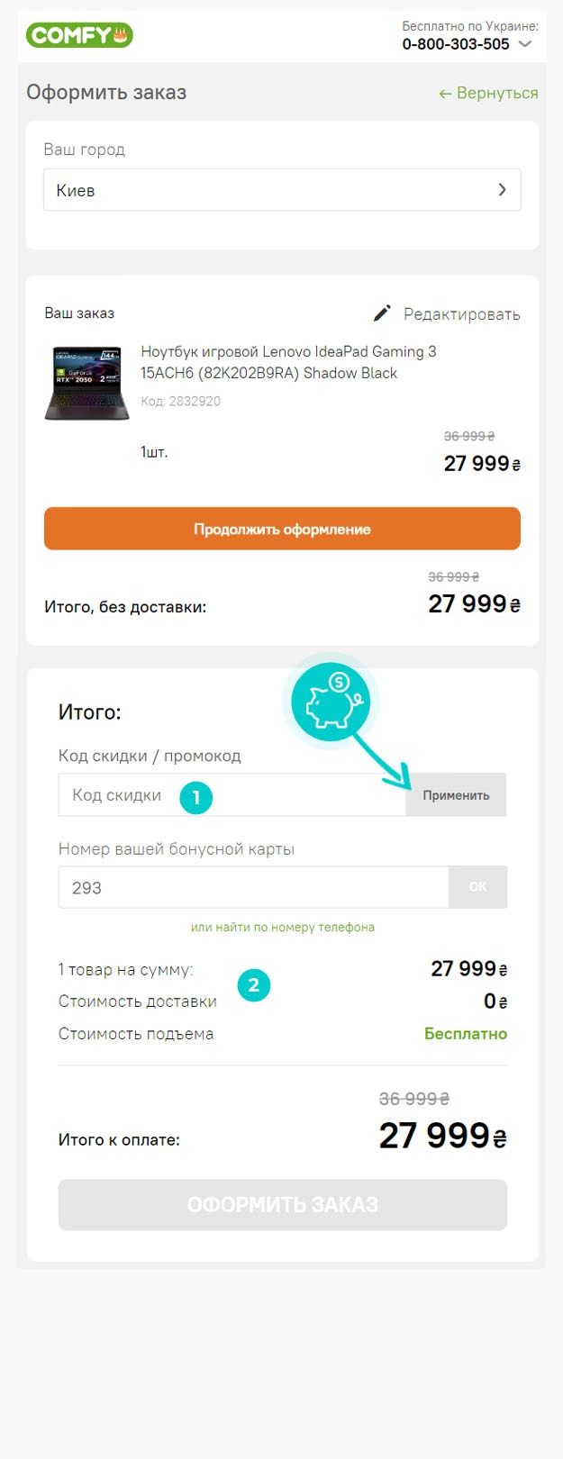 Оберіть товар, який вас цікавить, в онлайн-магазині Comfy.ua, натисніть кнопку «Додати до кошика», і продукт буде автоматично додано до кошика для замовлень. Безпосередньо в кошику ви знайдете поле «Введіть промокод» в розділі «Додати» праворуч. Вставте сюди скопійований код знижки або введіть його вручну та підтвердьте кнопкою «Застосувати».