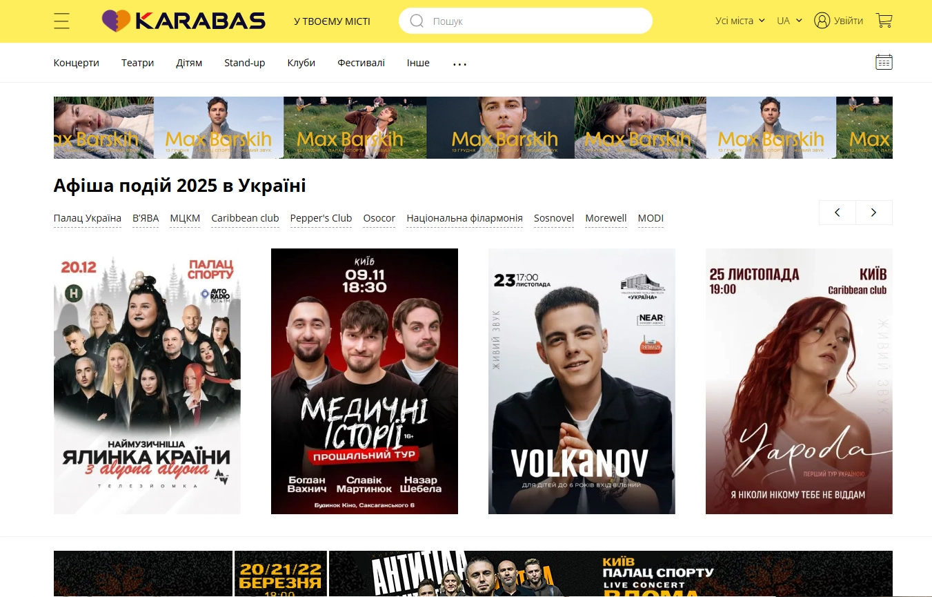 Концерти — для любителів музики сайт пропонує квитки на виступи українських та світових виконавців у великих містах, таких як Київ, Львів, Одеса та Харків, а також у багатьох інших населених пунктах України. Фестивалі охоплюють різні жанри — музичні, театральні та культурні події, що дозволяє відвідати масштабні заходи та отримати незабутні емоції. Також ви можете відвідати найкращі театри країни або насолодитися виставами. Дитячі розважальні шоу та комедійні виступи підходять для сімейного відпочинку, а також дозволяють весело провести час із друзями. Спортивні заходи включають матчі, турніри та інші спортивні події у великих містах і регіонах. А для економії вводьте промокод Karabas під час замовлення квитків.