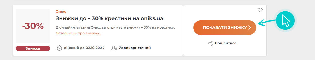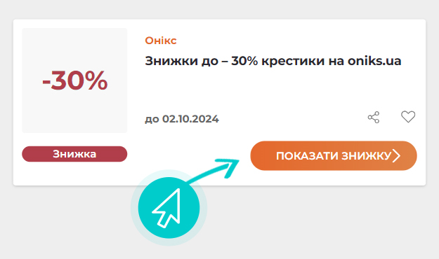 Детальніше про знижку...В онлайн-магазині Онікс ви отримаєте знижку – 30% на крестики. Знижка надається на умовах, зазначених самим магазином, які можуть бути змінені та докладніше доступні на сайті магазину.