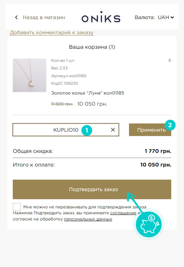 Оберіть товар, який вас цікавить, в онлайн-магазині Oniks.ua, натисніть кнопку «Додати до кошика», і продукт буде автоматично додано до кошика для замовлень. Безпосередньо в кошику ви знайдете поле «Введіть промокод» в розділі «Додати» праворуч. Вставте сюди скопійований код знижки або введіть його вручну та підтвердьте кнопкою «Застосувати».