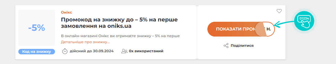 Оберіть на нашій сторінці конкретний промокод, який ви хочете використати в онлайн-магазині Oniks.ua. Натисніть на помаранчеву кнопку «Показати промокод».